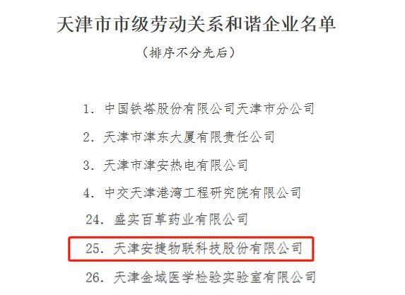 2022年4月26日,天津市人力资源和社会保障局发布了《市人社局等五部门关于命名天津市劳动关系和谐企业的决定》,命名天津kaiyun开云电竞物联科技股份有限公司等43户企业为“天津市市级劳动关系和谐企业”,有效期为2022年4月20日至2025年4月19日。